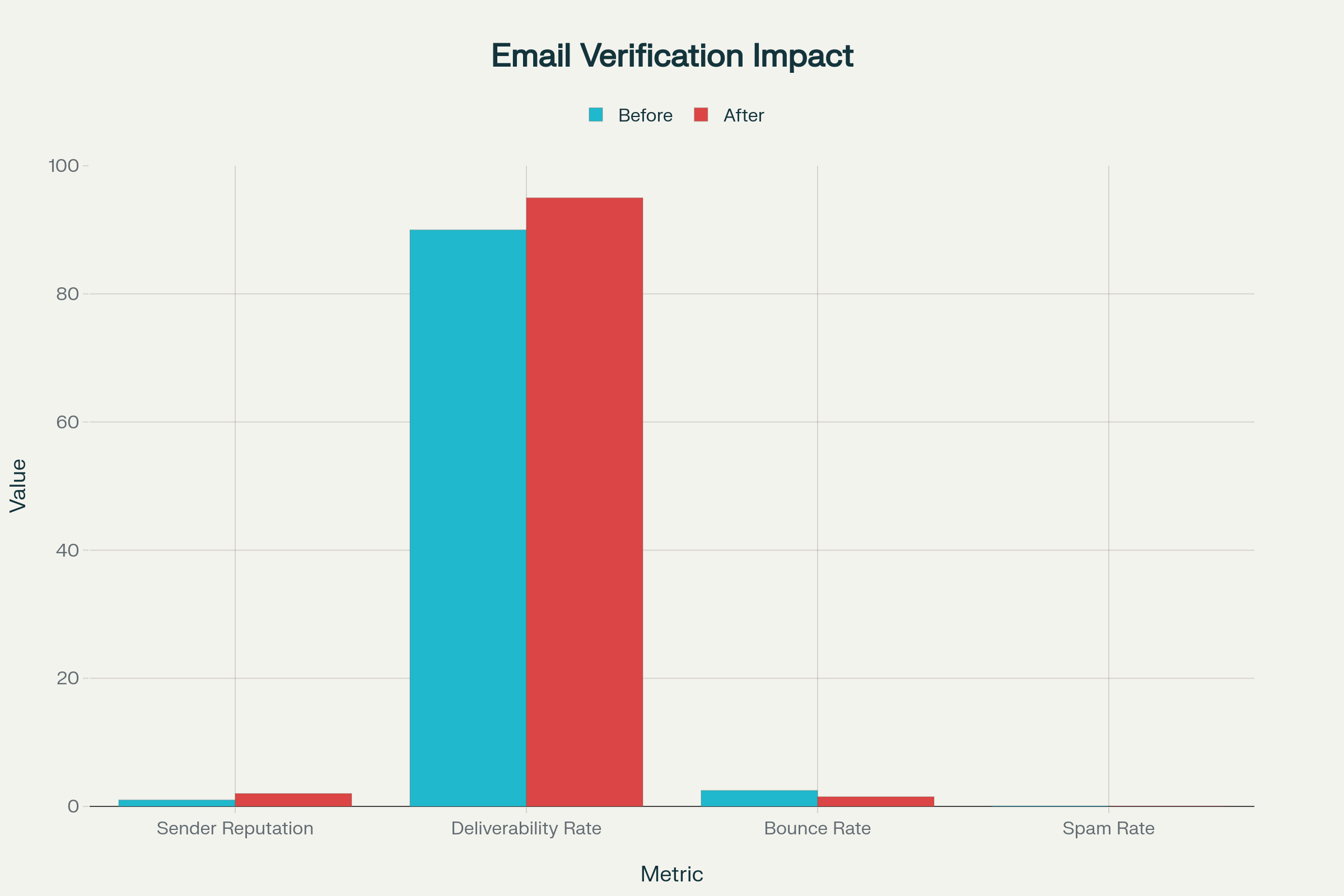 Proper email verification can improve deliverability rates by 25-40%, directly impacting campaign performance and revenue generation. Clean email lists result in: