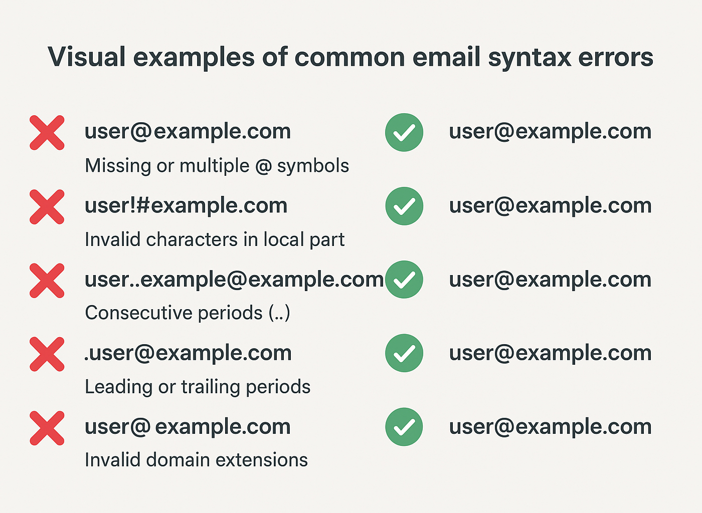 Syntax validation ensures email addresses follow RFC 5322 standards, preventing immediate bounces due to formatting errors. This foundational check identifies obvious issues before proceeding with more advanced verification methods.